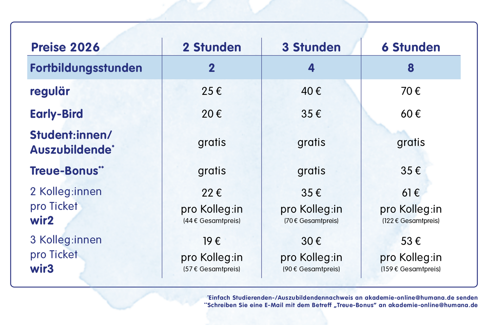 Hier erfahren Sie auf einen Blick, welche Rabatte und Aktionen wir für Sie haben und unter welchen Voraussetzungen diese Vergünstigungen gelten. Wir freuen uns auf Ihre Buchung und stehen für alle Rückfragen jederzeit unter akademie-online@humana.de zur Verfügung!